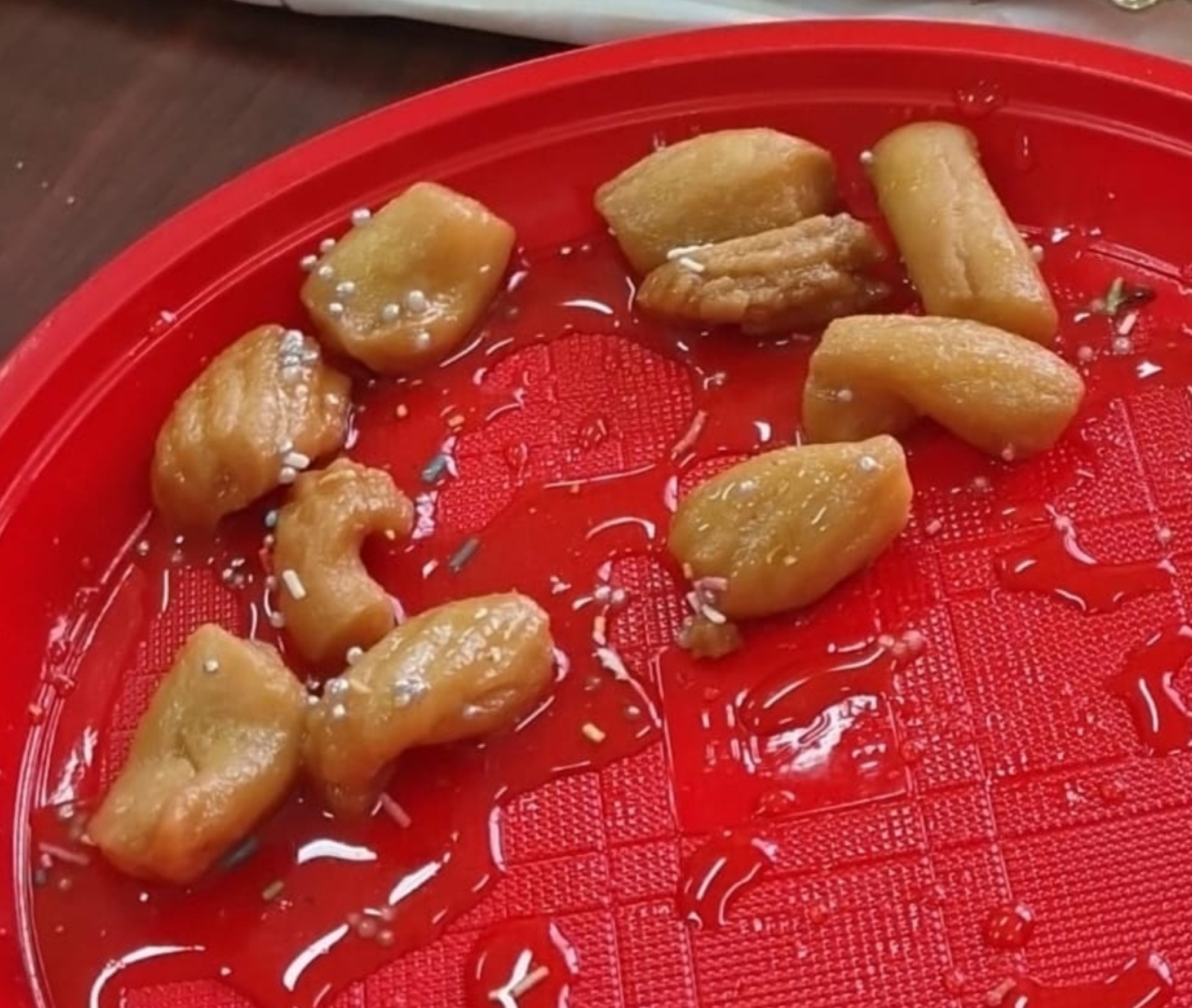 Once golden, the Purciddruzzi are immersed in the hot honey and then decorated with colored sprinkles and chopped almonds, thus creating a perfect combination of crunchiness and sweetness.